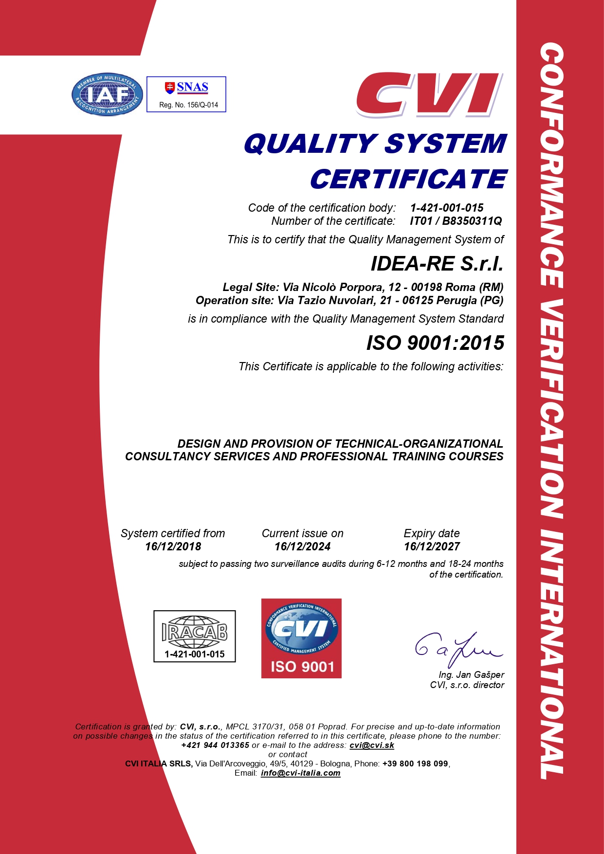 Following evaluation of its company management system, Idea-Re obtained the Certification of compliance with the standard ISO 9001:2015.